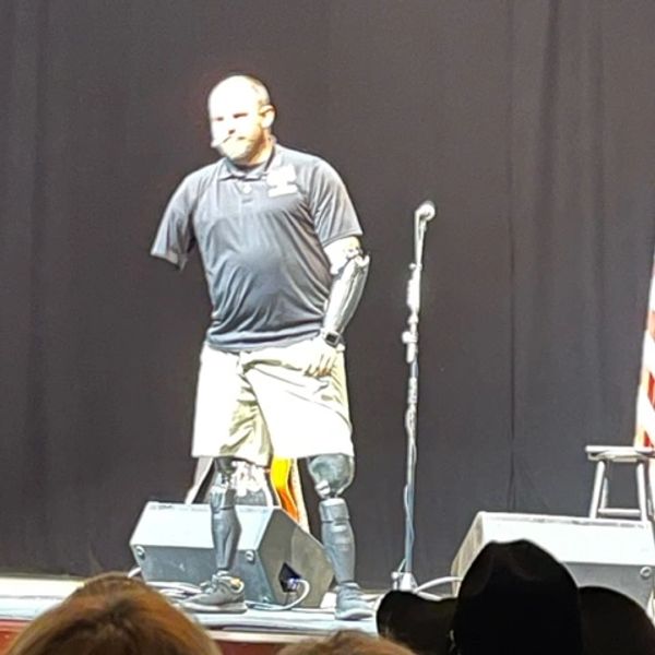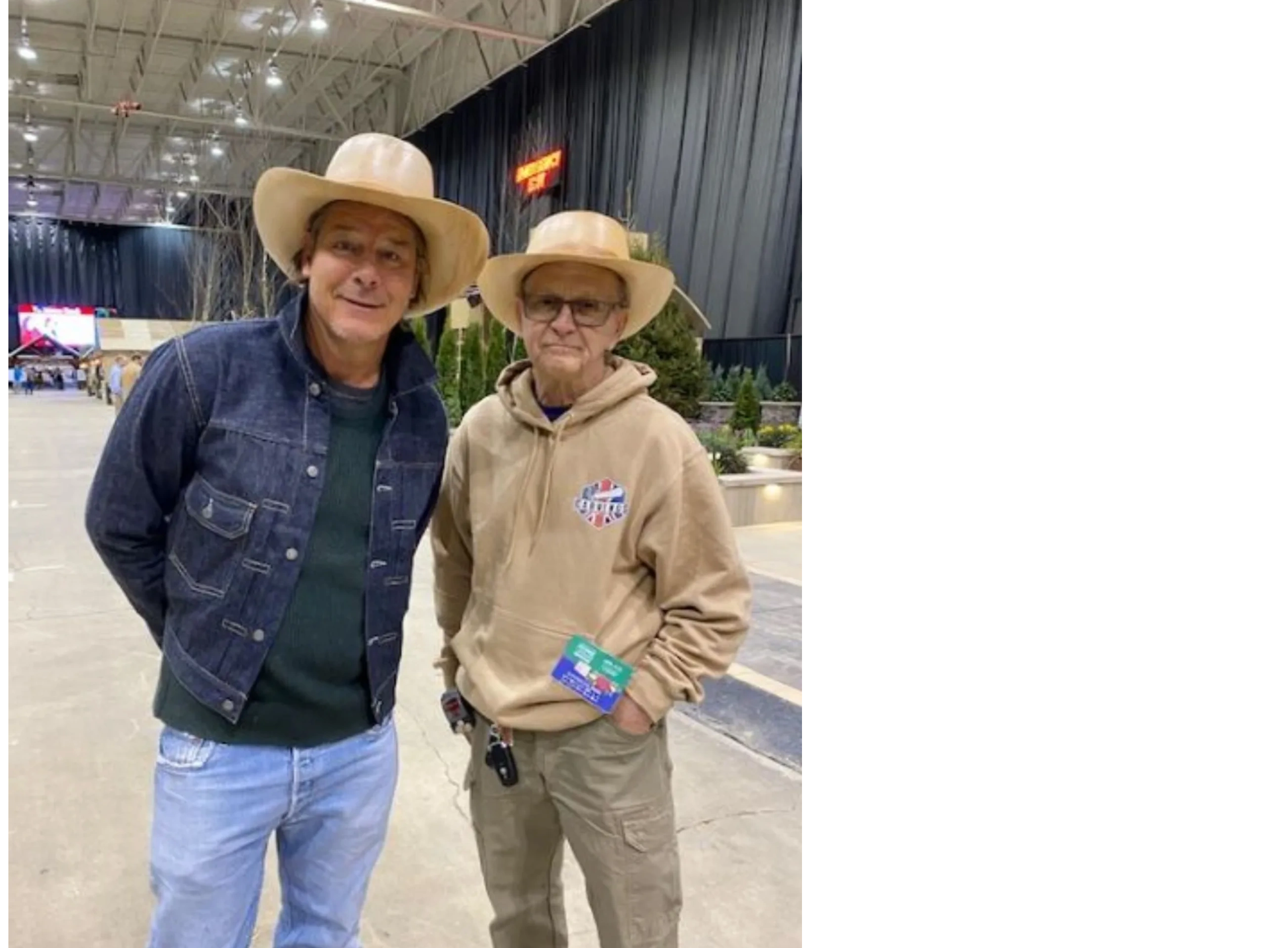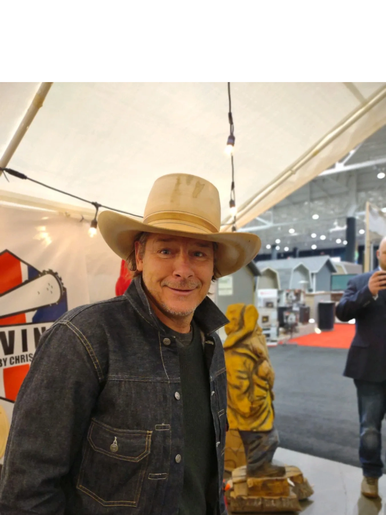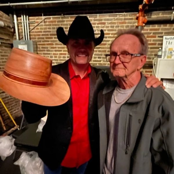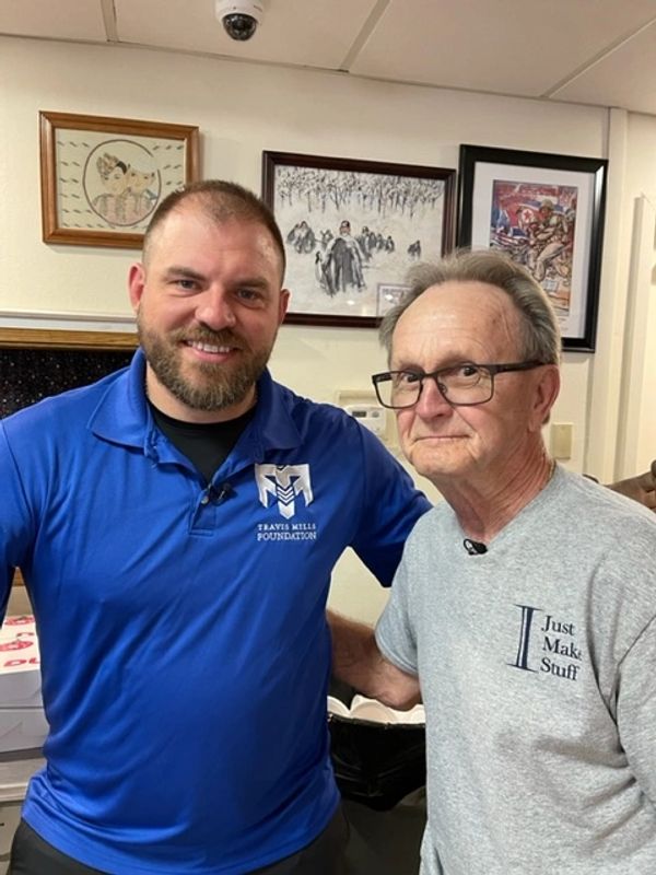 receiving his complimentary wood cowboy hat for his contribution to the Travis Mills Foundation.